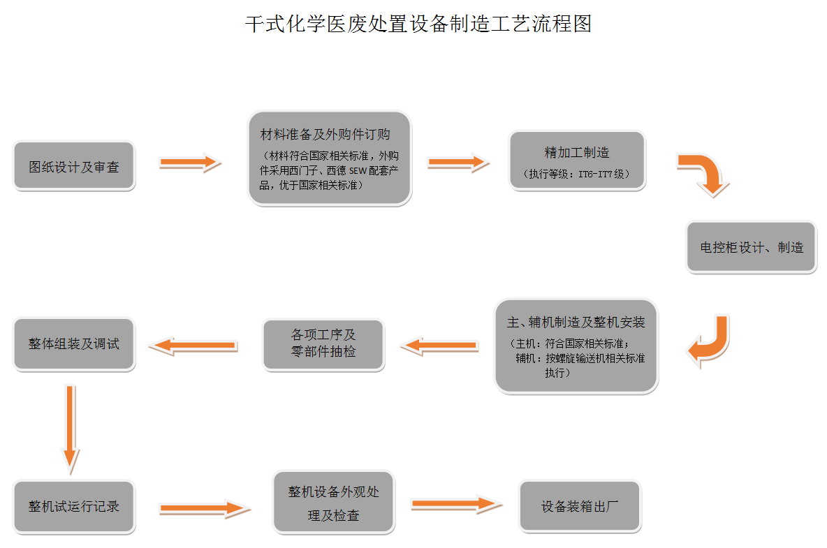 本公司研制的醫(yī)療廢物處理設(shè)備完全達(dá)到“中華人民共和國環(huán)境保護(hù)行業(yè)標(biāo)準(zhǔn)HJ/T228-2005《醫(yī)療廢物化學(xué)消毒集中處理工程技術(shù)規(guī)范》”,具有操作簡單、一次性投資少、運(yùn)行費(fèi)用低、占地面積小、減容率高、無廢水廢氣產(chǎn)生的優(yōu)點(diǎn)。